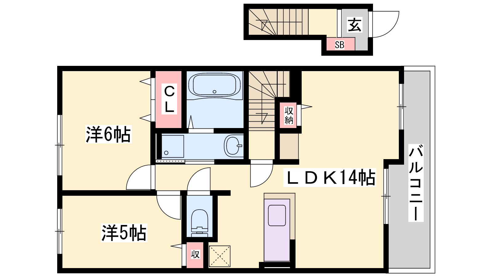 - LDK14帖、洋室6帖、洋室5帖