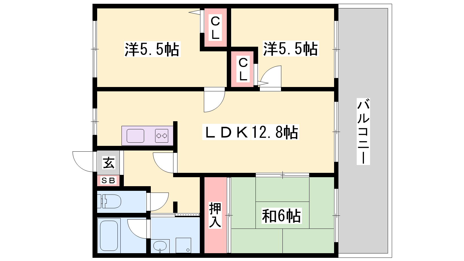 - LDK12帖、和室6帖、洋室5.5帖、洋室5.5帖
