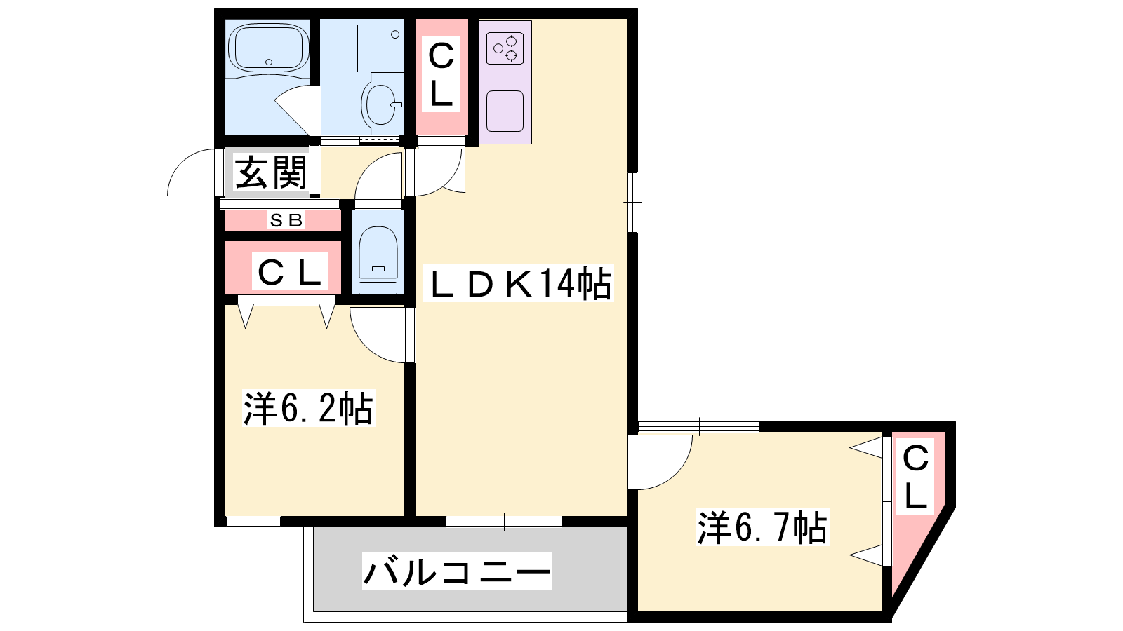 - LDK14帖、洋室6.7帖、洋室6.2帖