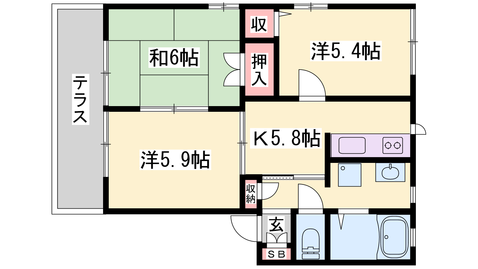 - K5.8帖、洋室5.4帖、洋室5.9帖、和室5.9帖