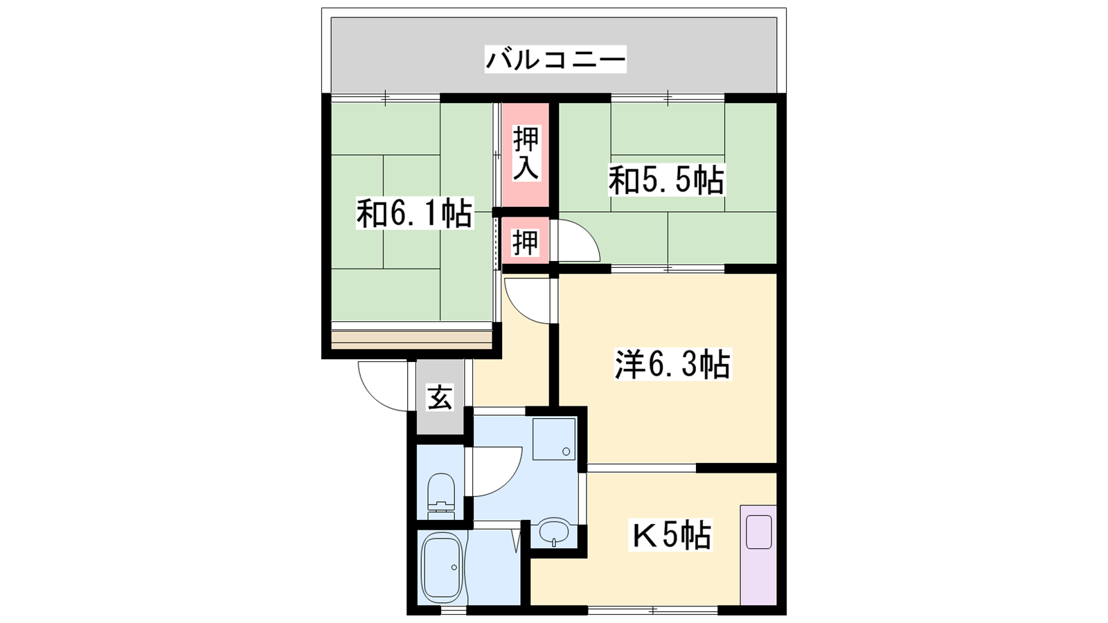 - K5帖、洋室6.3帖、和室5.5帖、和室6.1帖