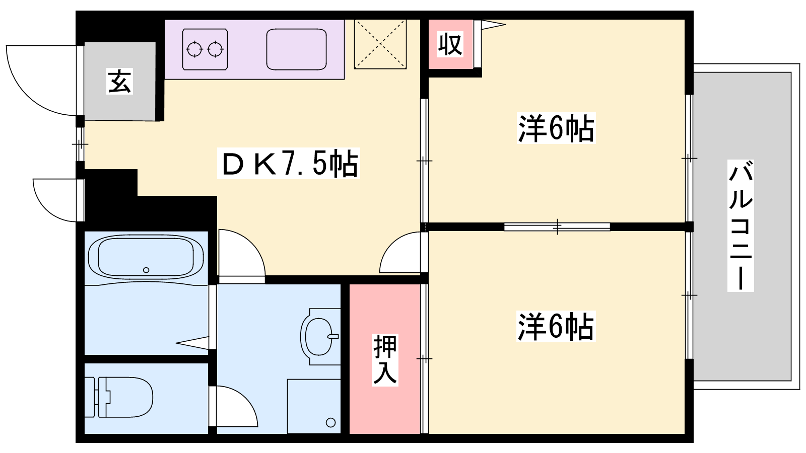 - DK7.5帖、洋室6帖、洋室6帖