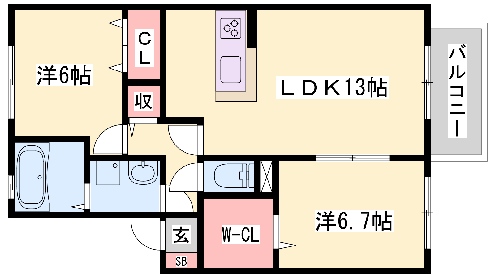 - LDK13帖、洋室6.7帖、洋室6帖