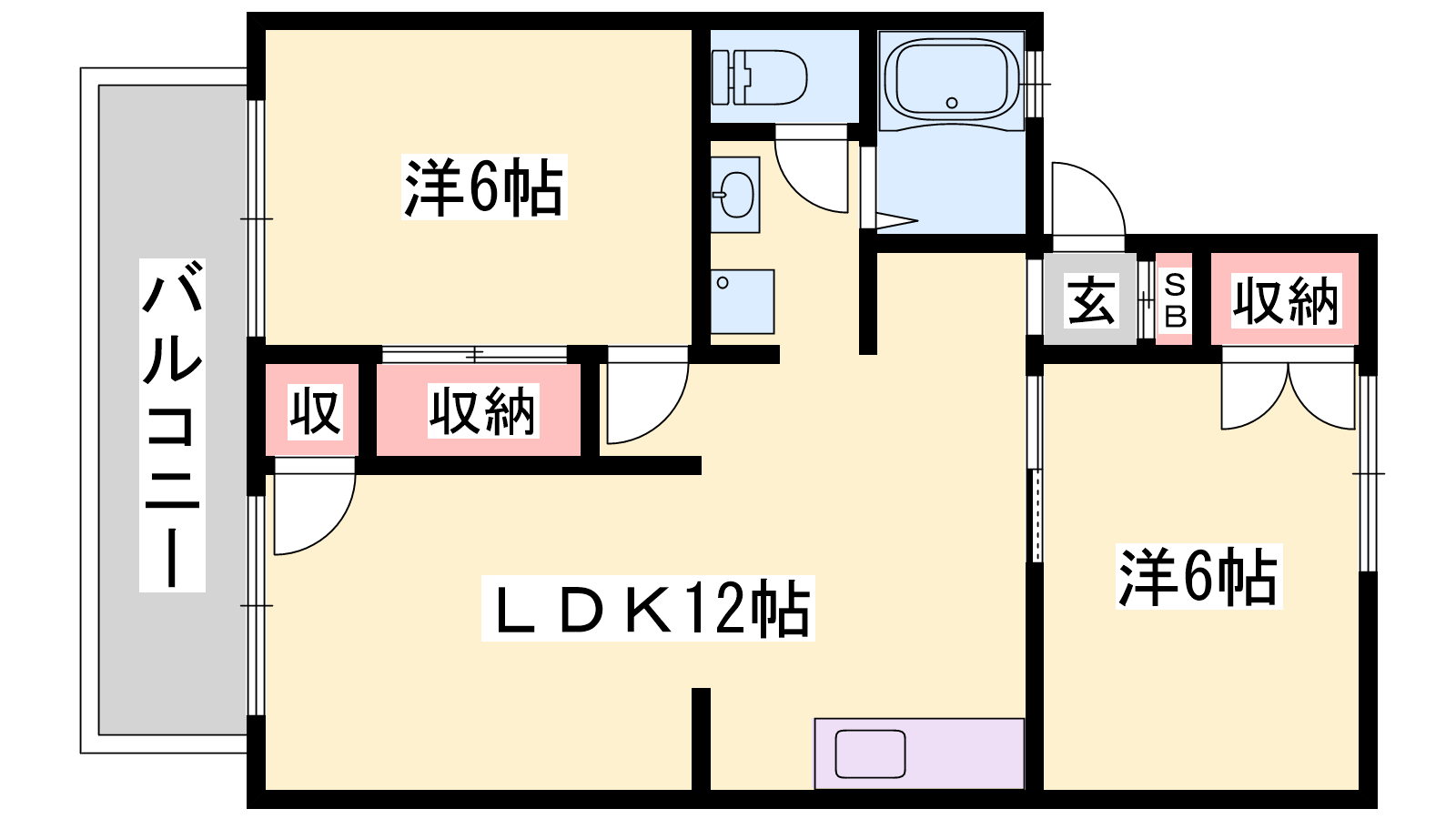 - LDK12帖、洋室6帖、洋室6帖