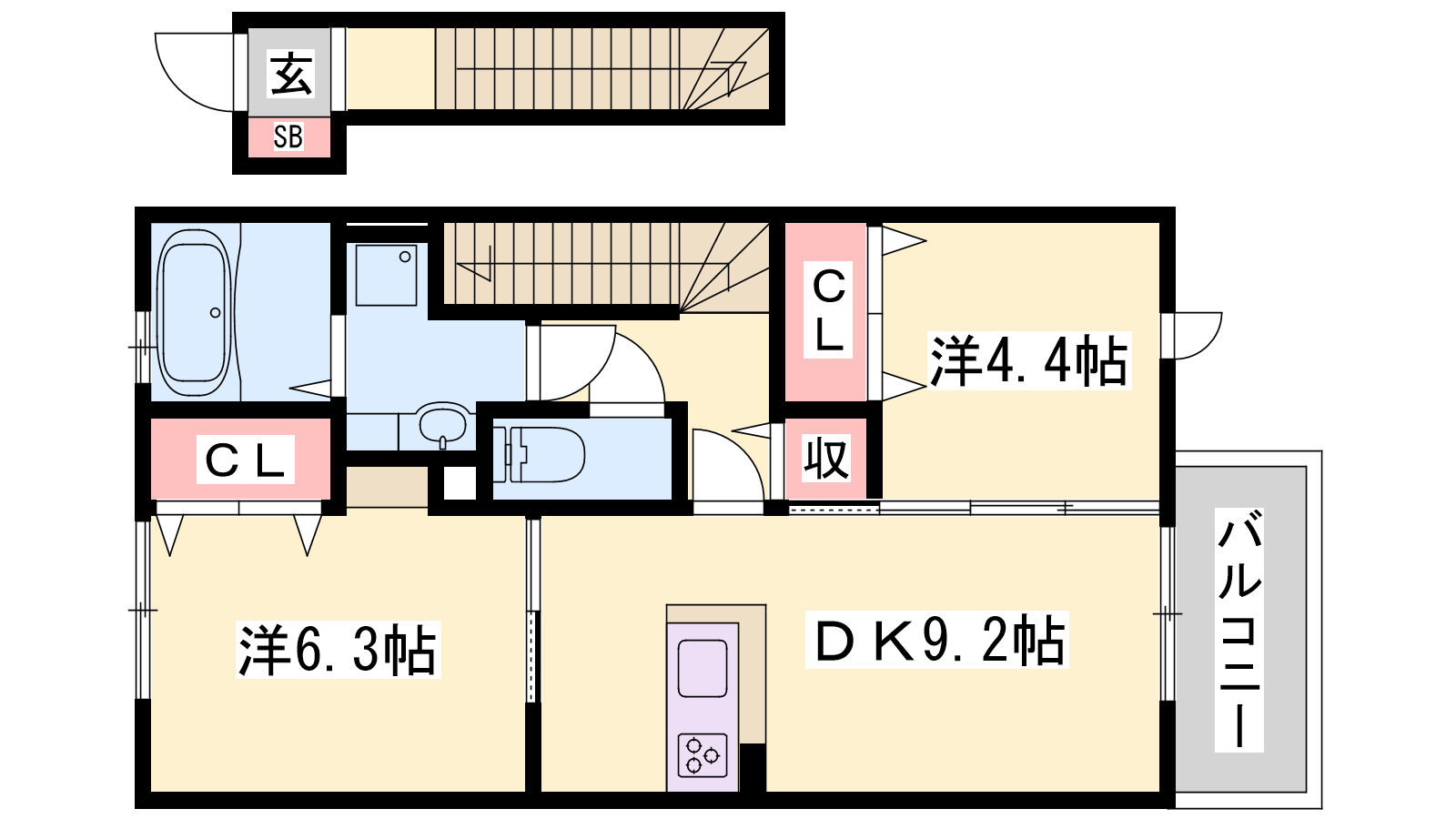 - DK9.2帖、洋室6.3帖、洋室4.4帖