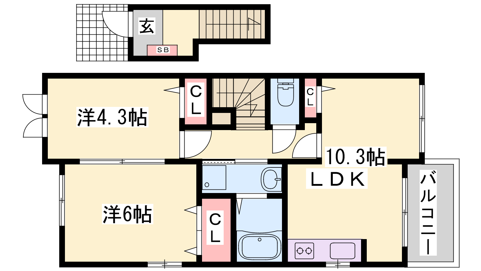 - LDK10.3帖、洋室6帖、洋室4.3帖