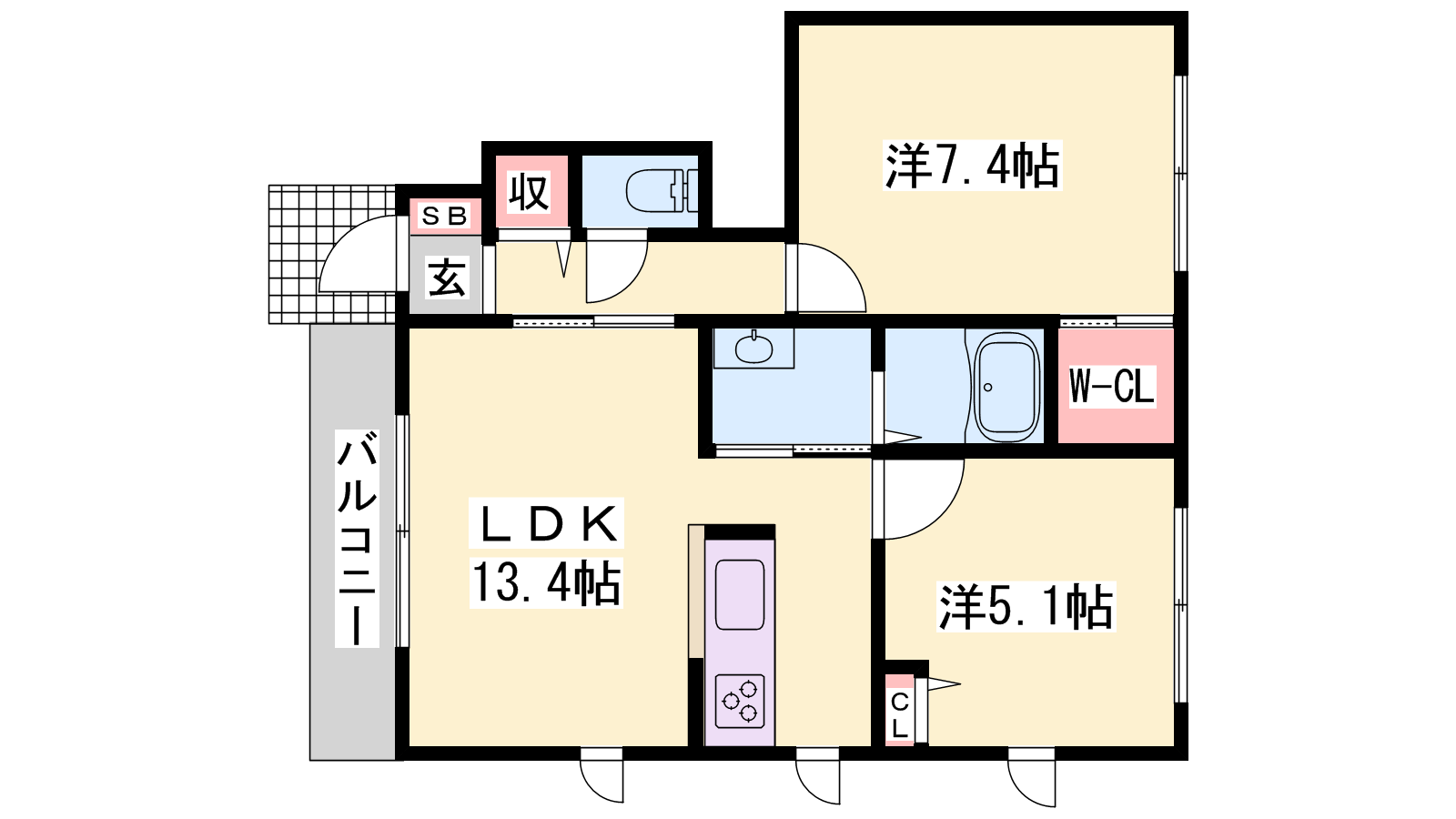 - LDK13.4帖、洋室7.4帖、洋室5.1帖