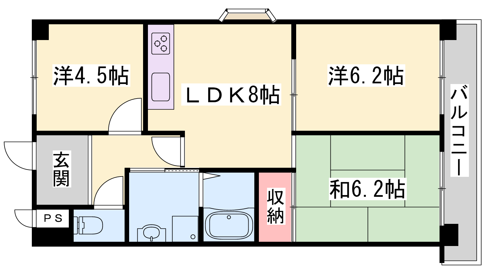 - LDK8帖、洋室6.2帖、和室6.2帖、洋室4.5帖