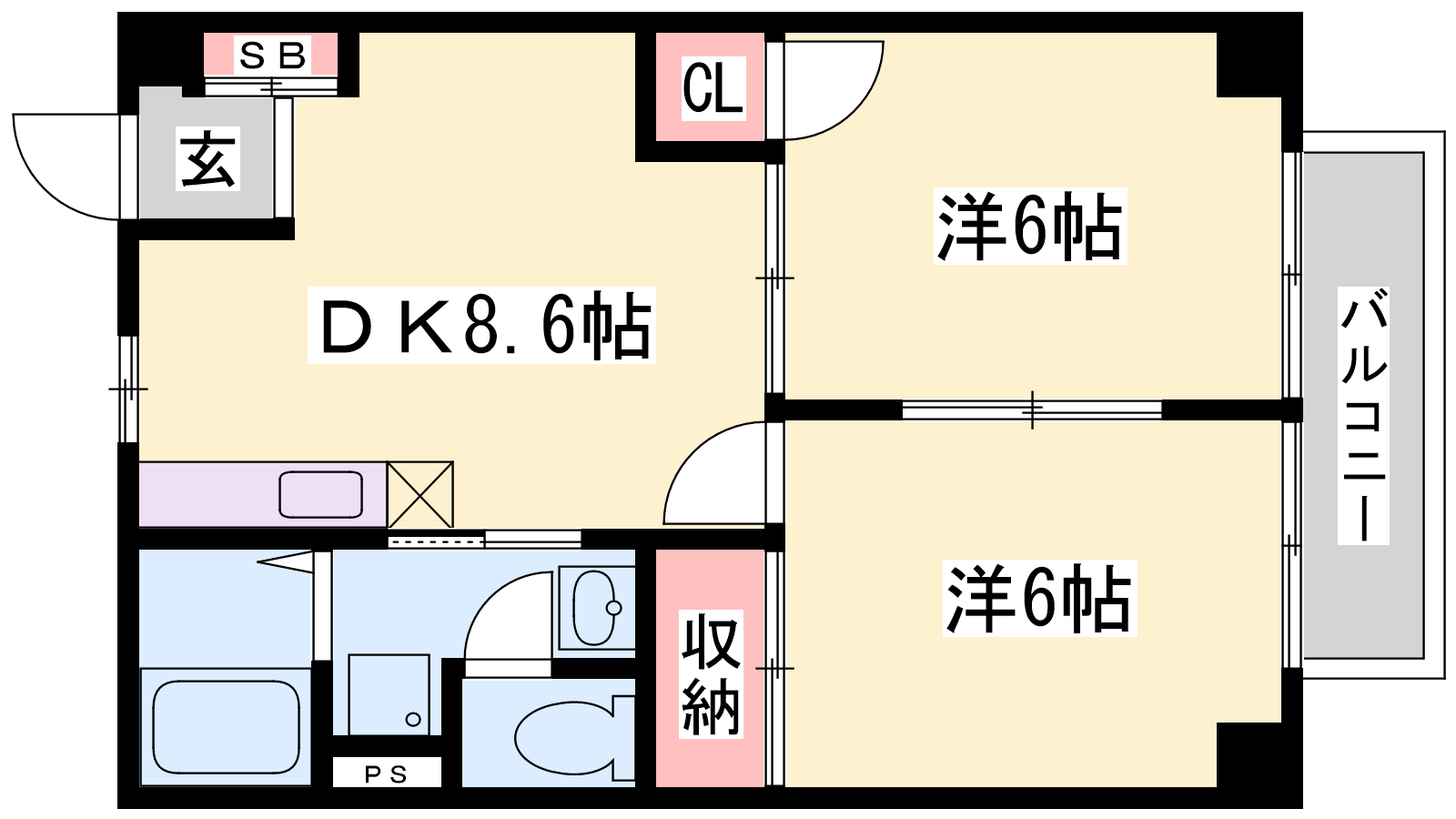 - DK8.6帖、洋室6帖、和室6帖