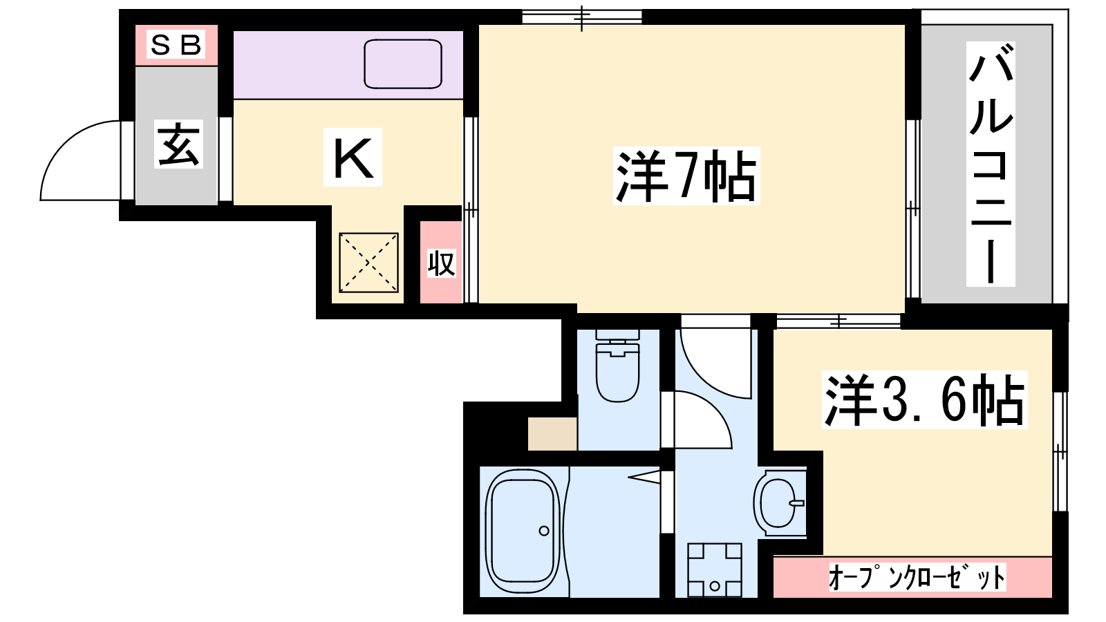 - K2.2帖、洋室7帖、S3.6帖