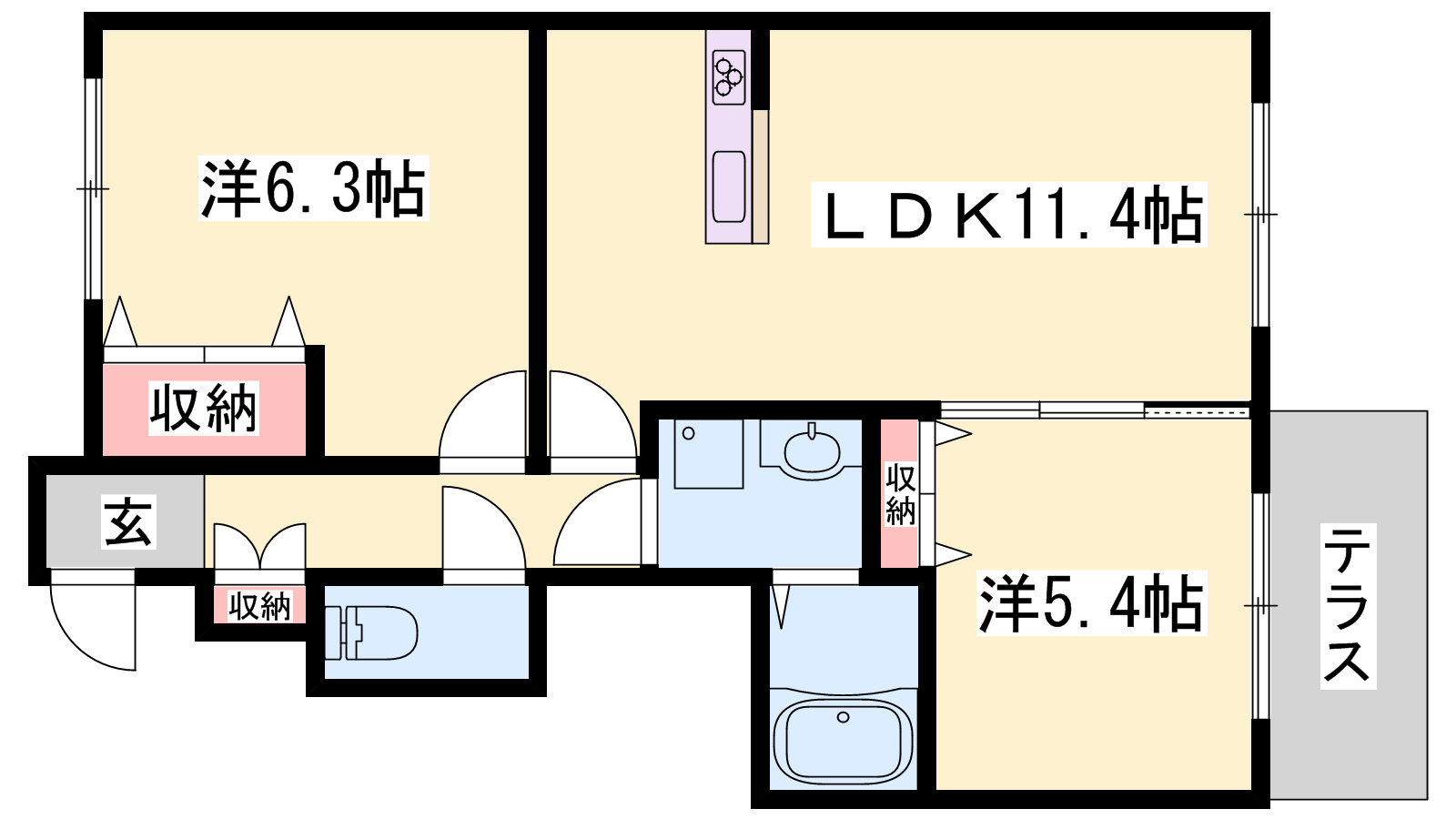 - LDK11.4帖、洋室6.3帖、洋室5.4帖
