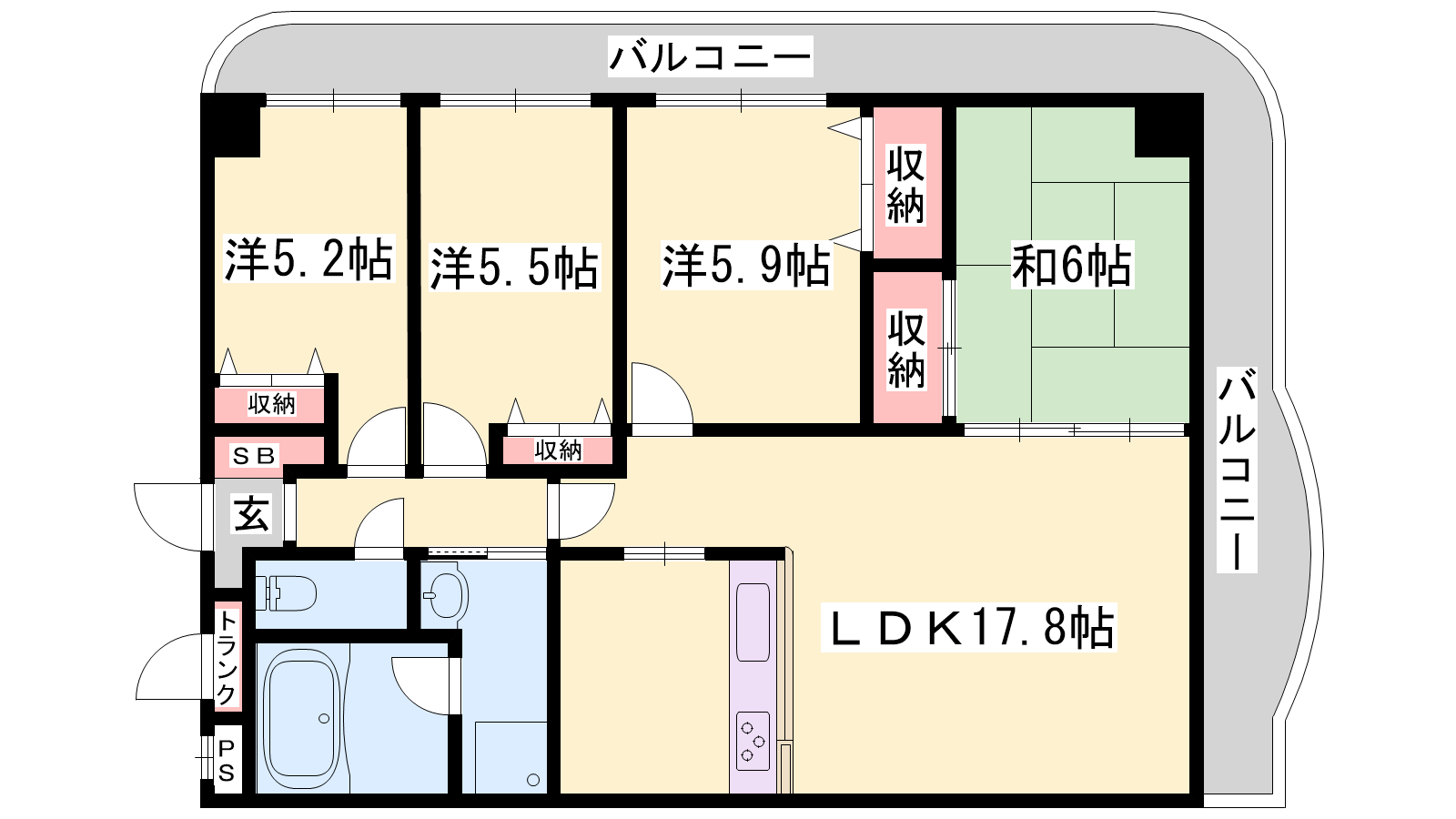 - LDK17.8帖、洋室5.9帖、洋室5.5帖、洋室5.2帖、和室6帖