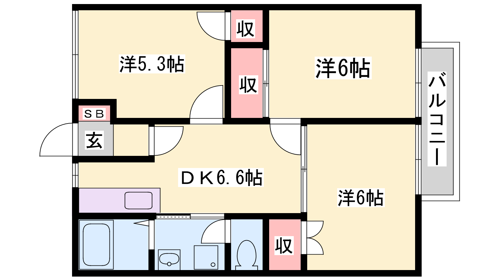 - DK6.6帖、洋室6帖、洋室6帖、洋室5.3帖