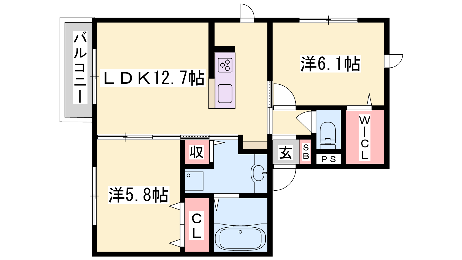 - LDK12.7帖、洋室6.1帖、洋室5.8帖