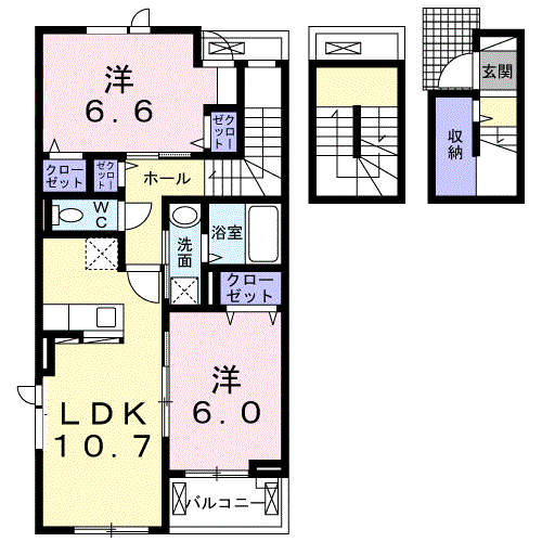 - LDK10.7帖、洋室6.6帖、洋室6帖