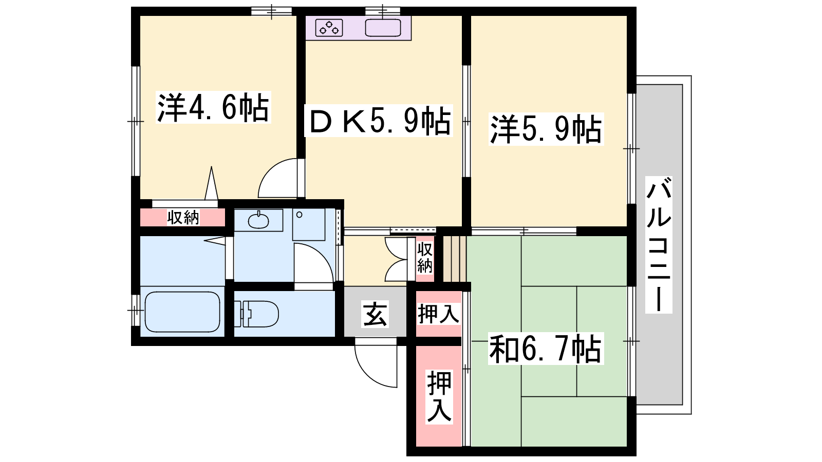 - K5.9帖、洋室5.9帖、洋室4.6帖、和室6.7帖