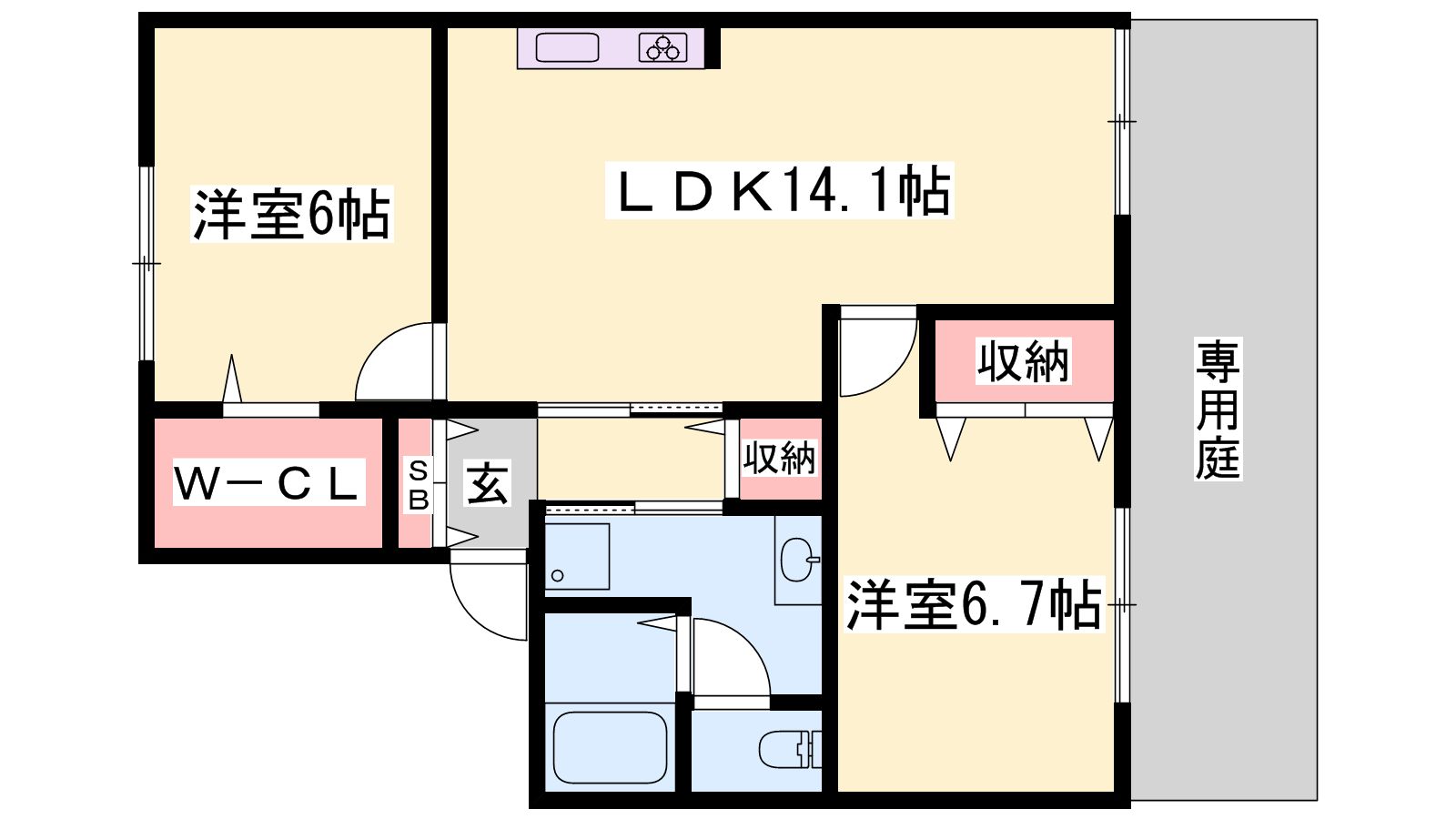 - LDK14.1帖、洋室6.7帖、洋室6帖