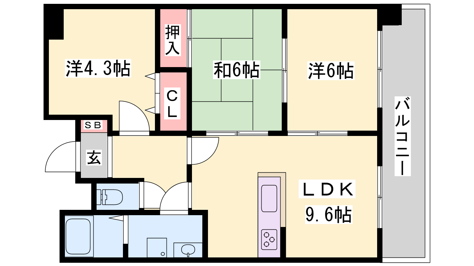 - LDK9.6帖、洋室6帖、和室6帖、洋室4.3帖