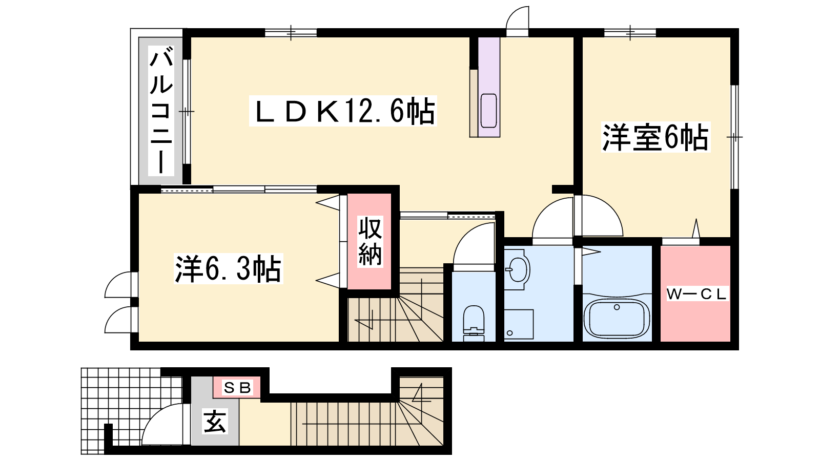 - LDK12.6帖、洋室6.3帖、洋室6帖