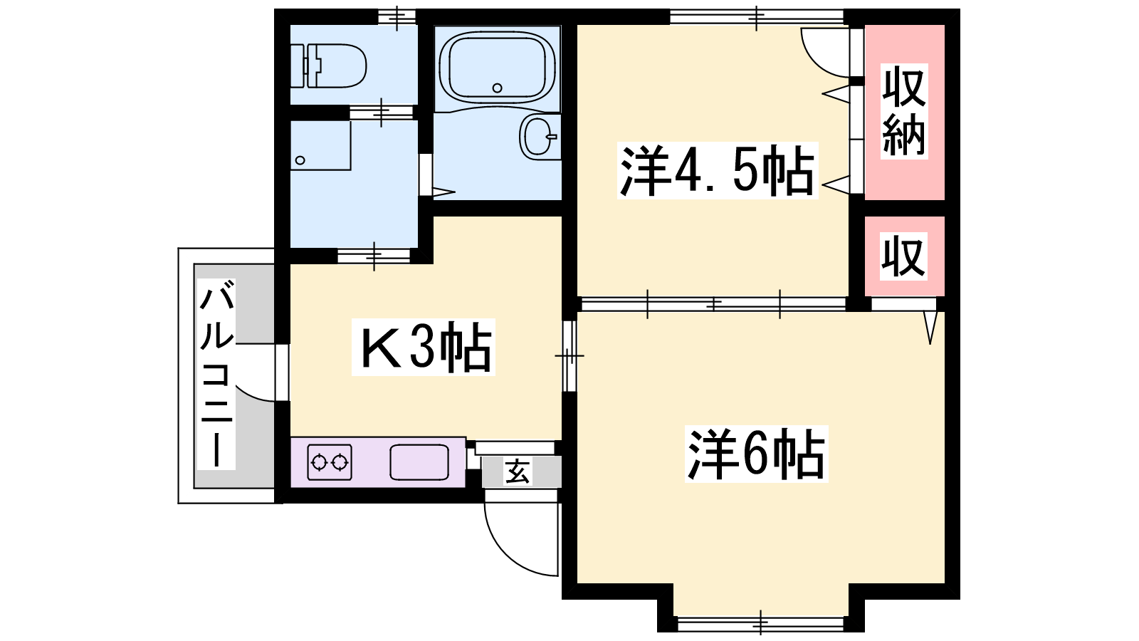 - K3帖、洋室6帖、洋室4.5帖