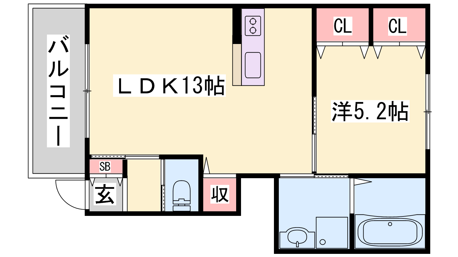 - LDK13帖、洋室5.2帖