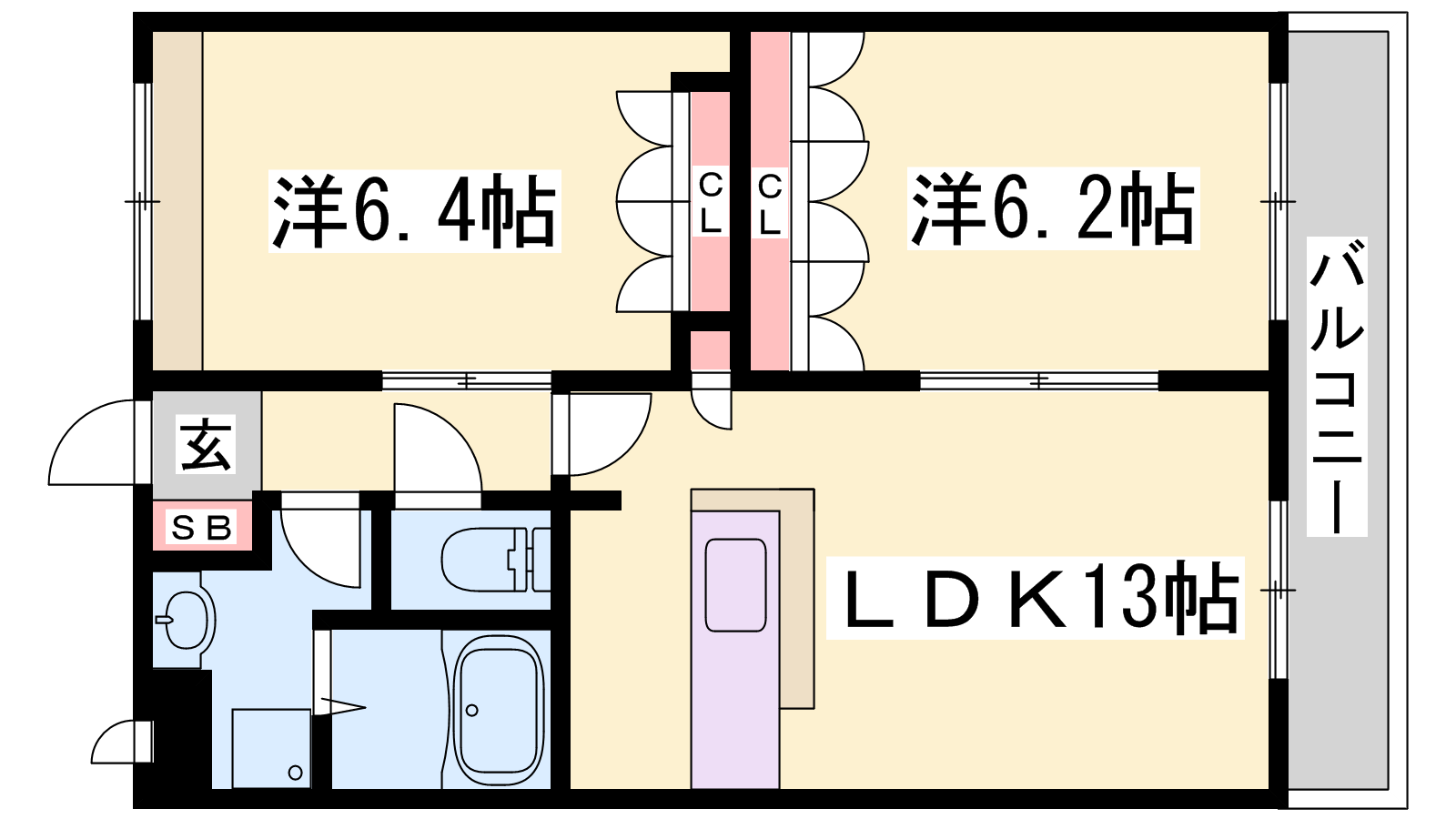 - LDK13帖、洋室6.2帖、洋室6.4帖