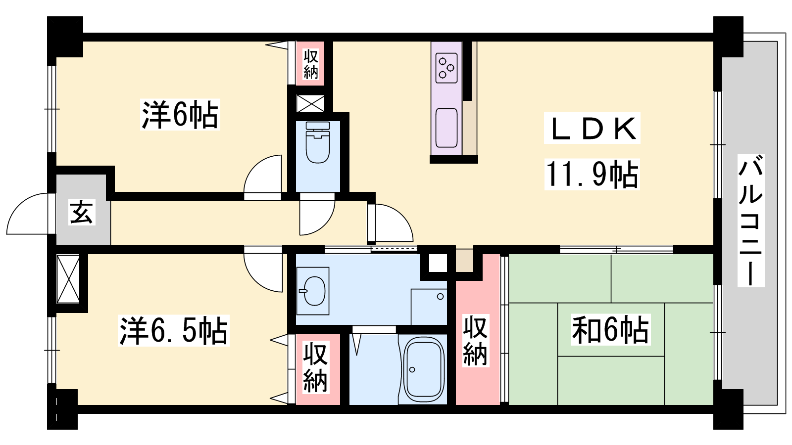 - LDK11.9帖、洋室6帖、洋室6.5帖、和室6帖