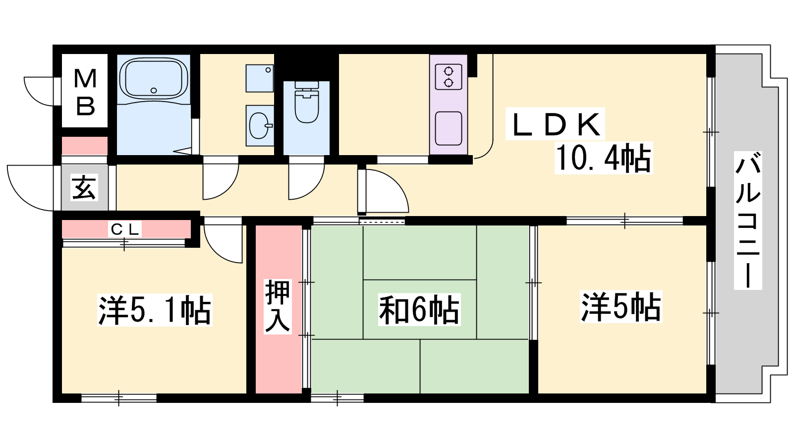 - LDK10.4帖、洋室5.1帖、洋室5帖、和室6.6帖