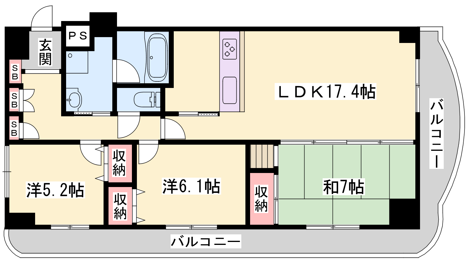- LDK17.4帖、洋室6.1帖、洋室5.2帖、和室7帖