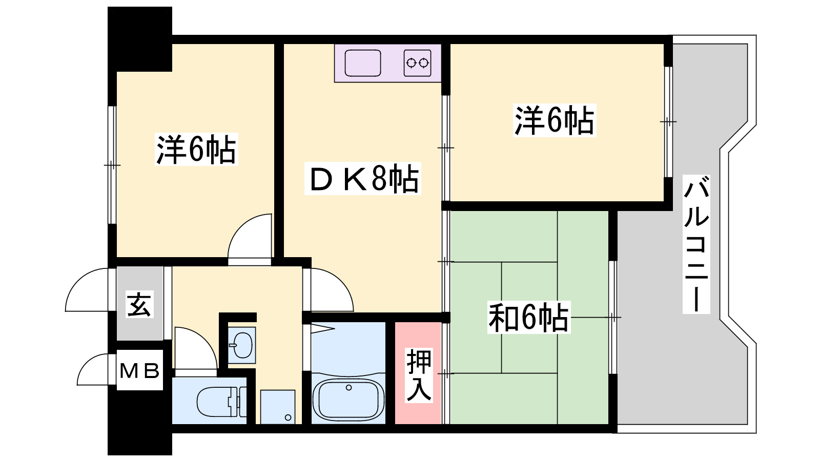 - DK8帖、洋室6帖、洋室6帖、和室6帖