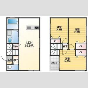 - LDK14.8帖、洋室6.4帖、洋室5.7帖、洋室5.2帖