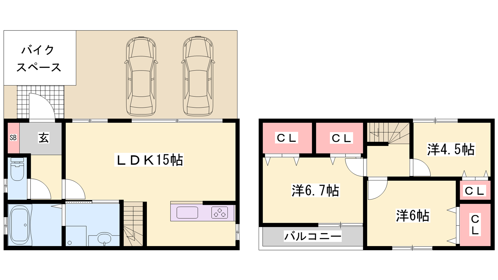 - LDK15帖、洋室6.7帖、洋室6帖、洋室4.5帖