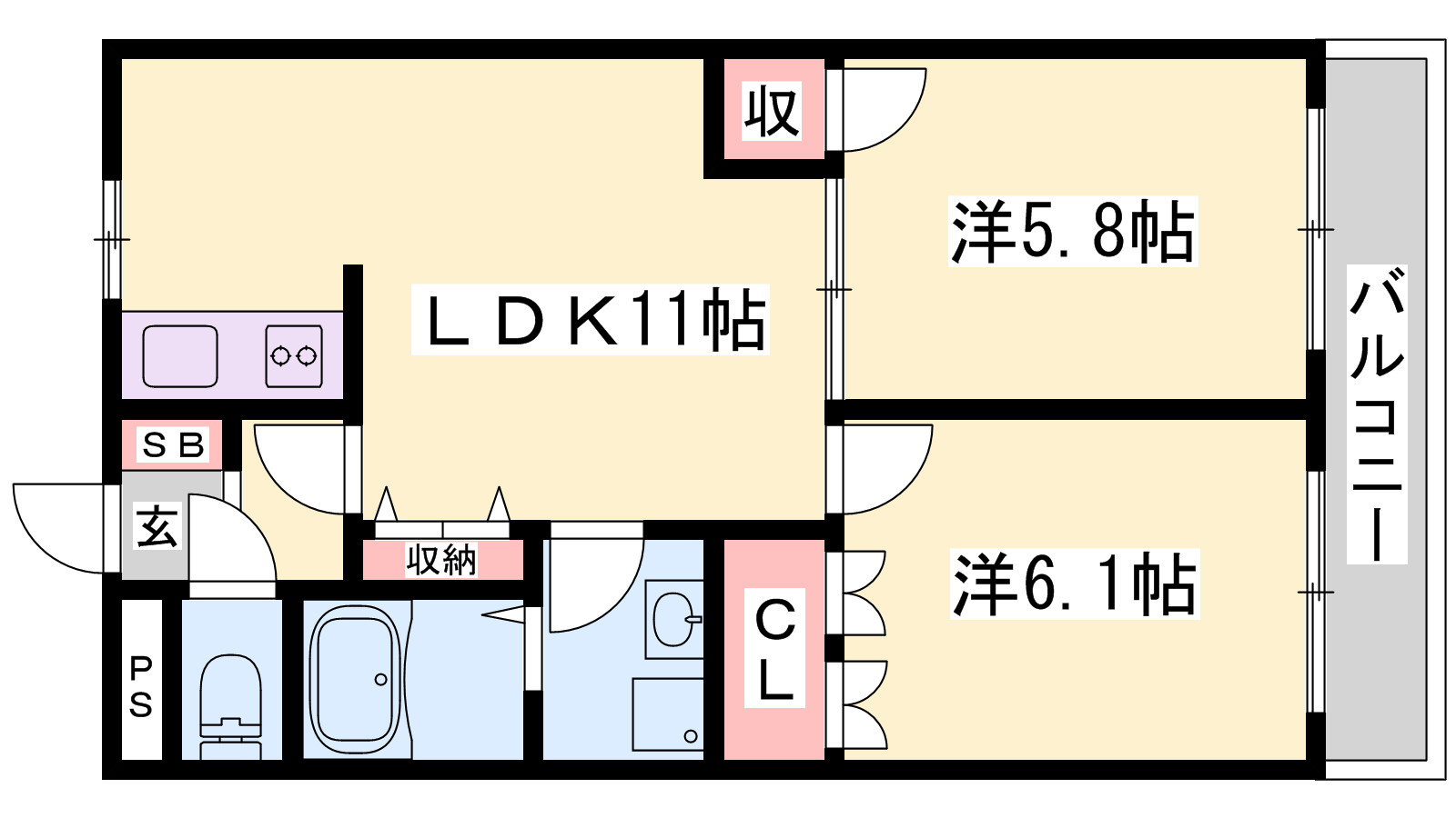 - LDK11帖、洋室6.1帖、洋室5.8帖
