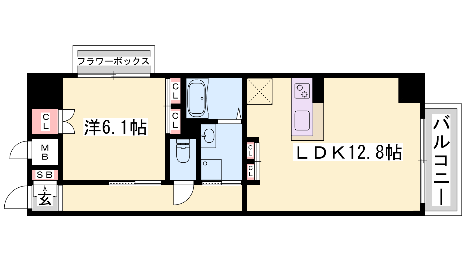 - LDK12.8帖、洋室6.1帖