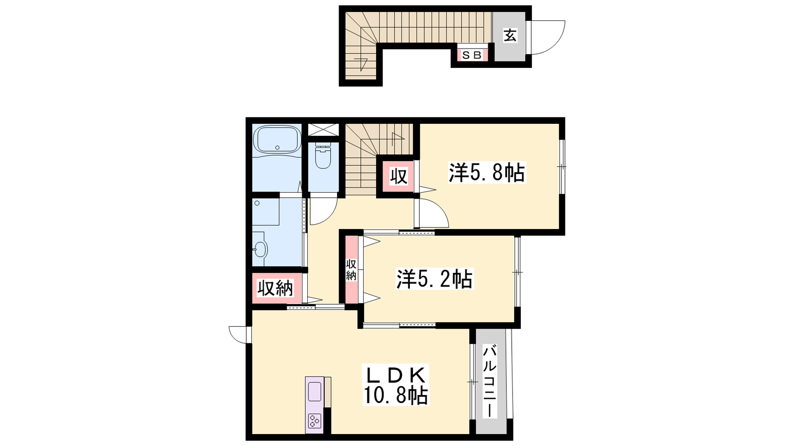 - LDK10帖、洋室5.8帖、洋室5.2帖