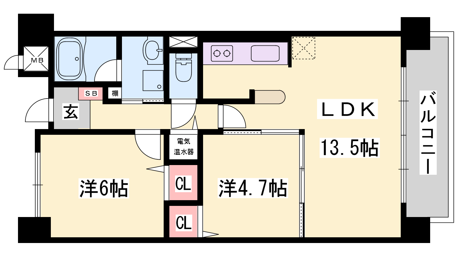 - LDK13.5帖、洋室6帖、洋室4.7帖