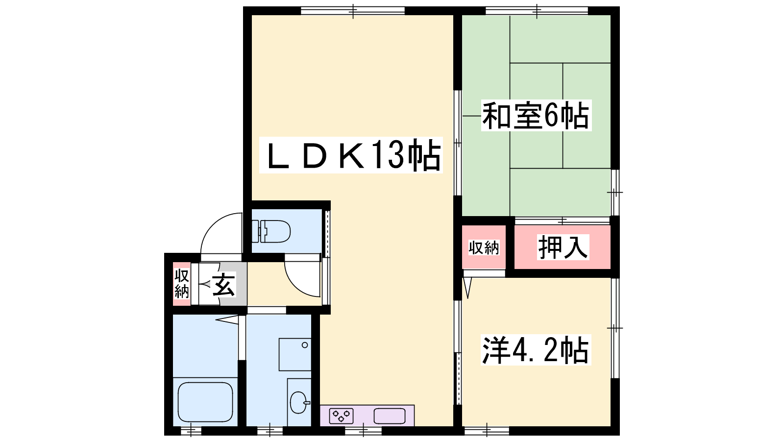 - LDK13帖、洋室5.9帖、洋室4.2帖