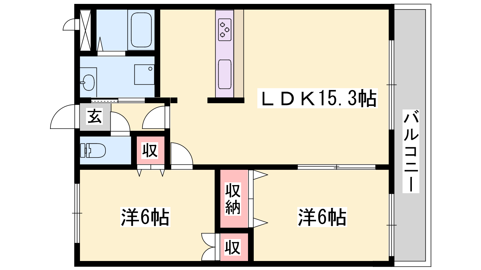 - LDK15.3帖、洋室6帖、洋室6帖
