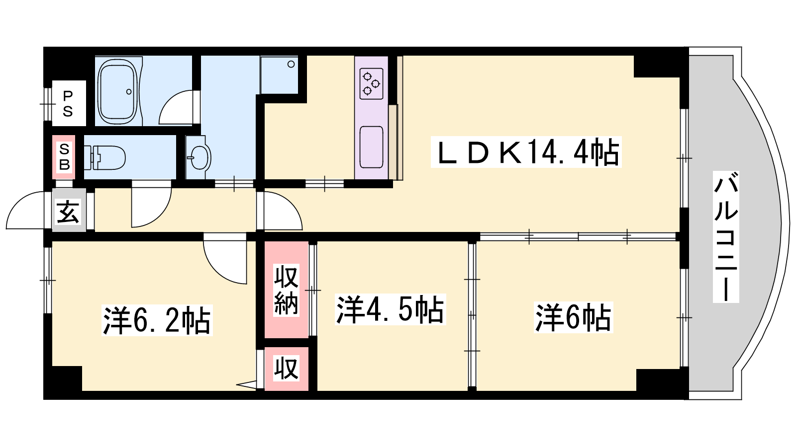 - LDK14.4帖、洋室6.2帖、洋室6帖、洋室4.5帖