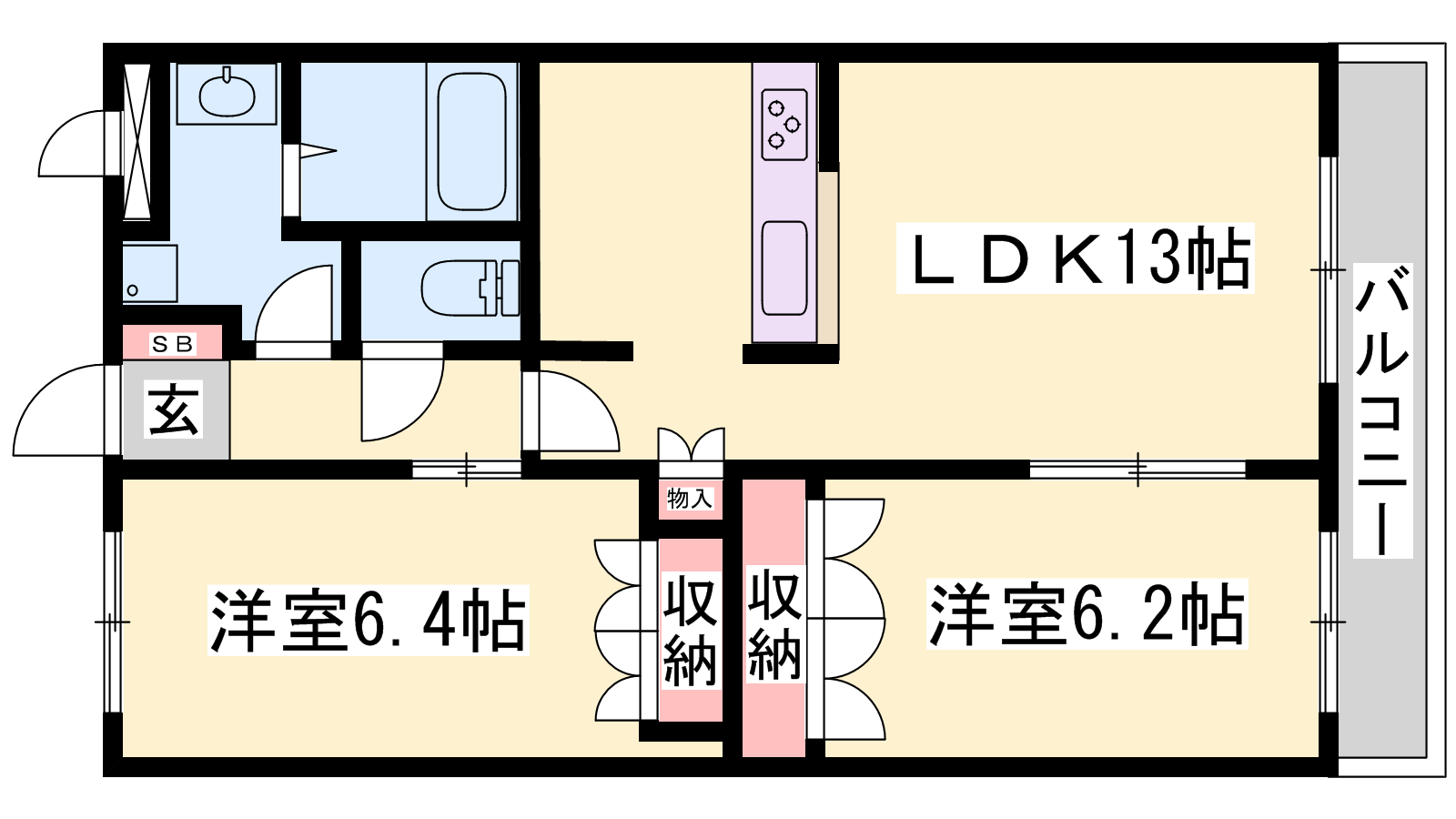 - LDK13帖、洋室6.4帖、洋室6.2帖