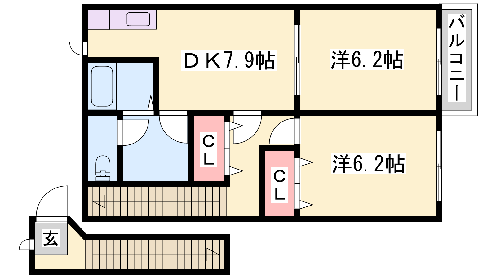- DK7.9帖、洋室6.2帖、洋室6.2帖