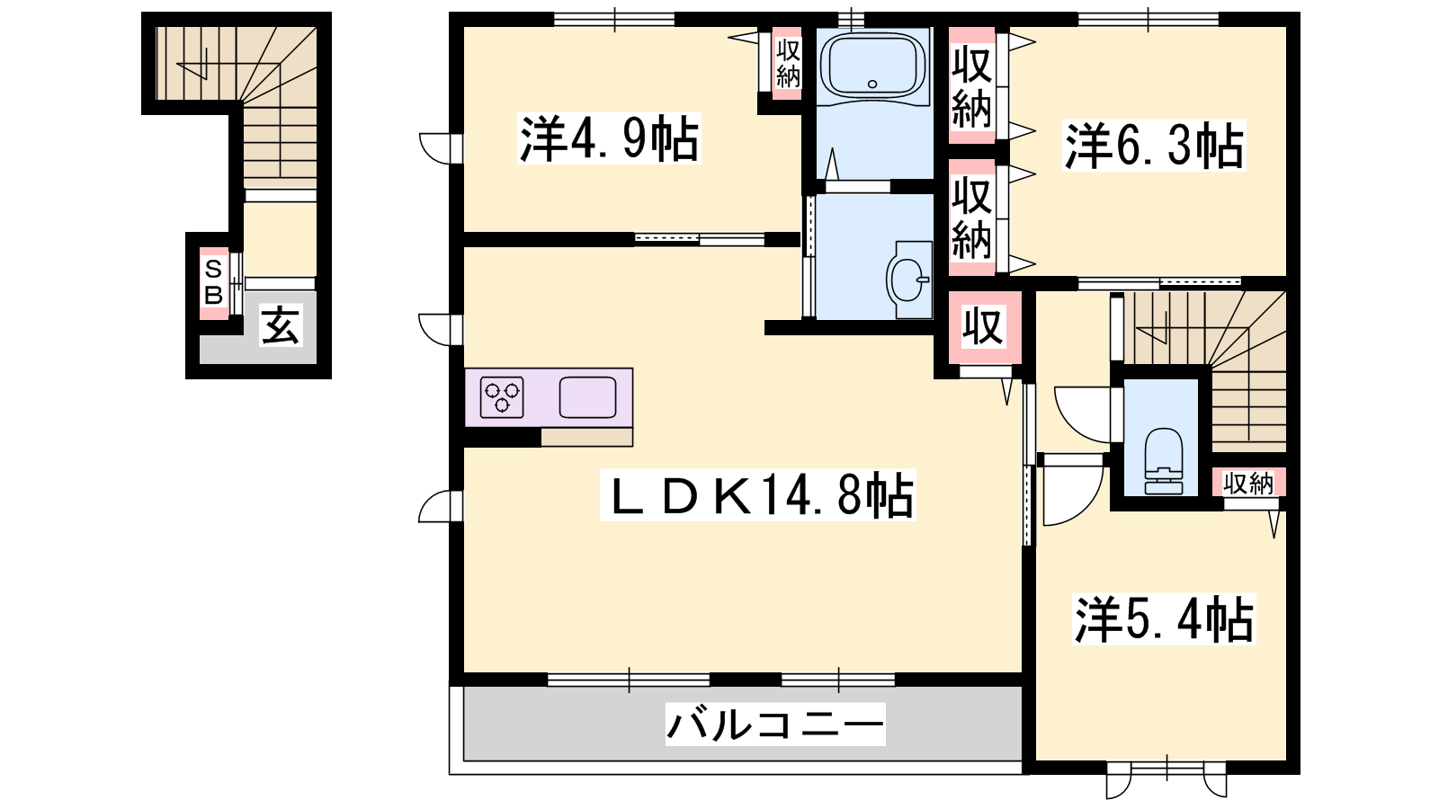 - LDK14.8帖、洋室5.4帖、洋室4.9帖、洋室6.3帖