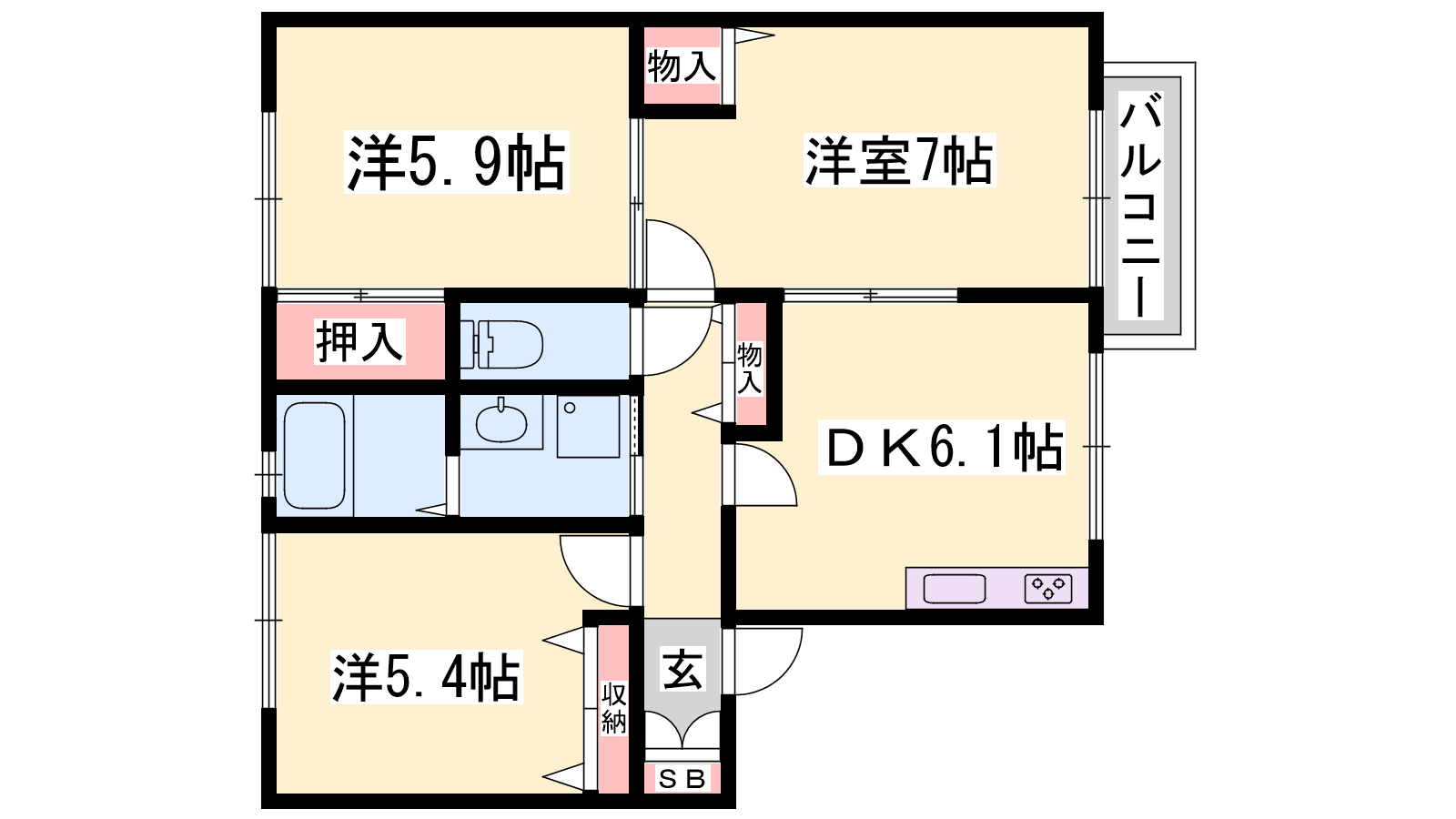 - DK6.1帖、洋室7帖、洋室5.4帖、和室5.9帖