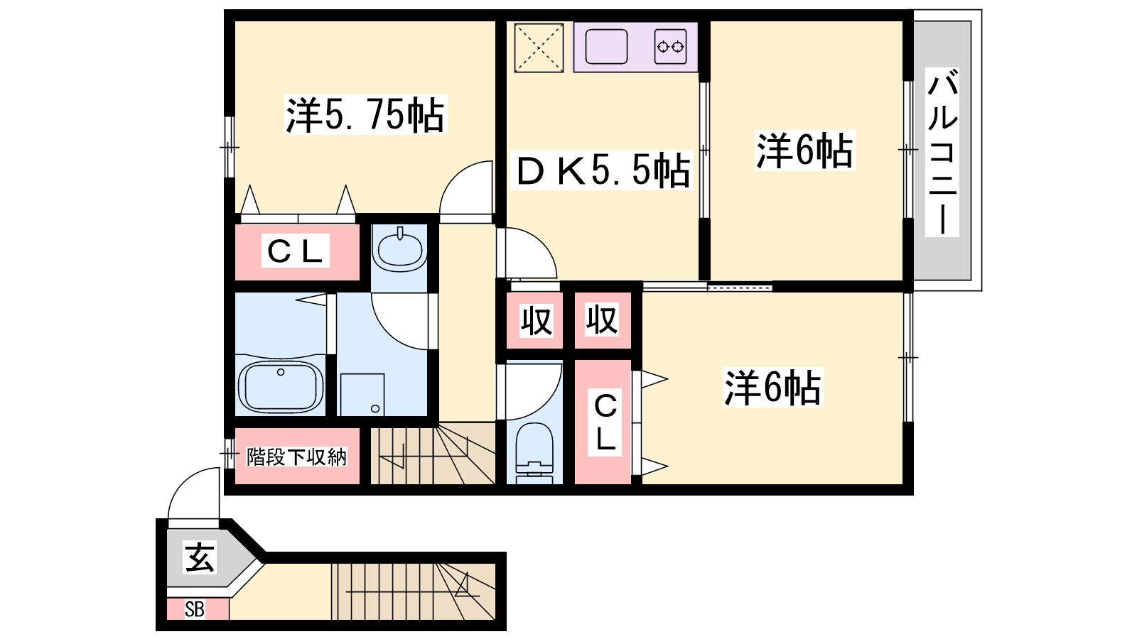 - DK5.5帖、洋室6帖、洋室6帖、洋室5.75帖