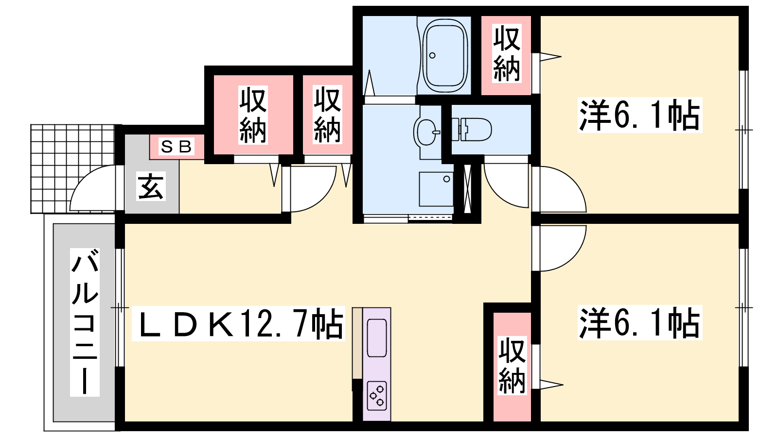 - LDK12.7帖、洋室6.1帖、洋室6.1帖