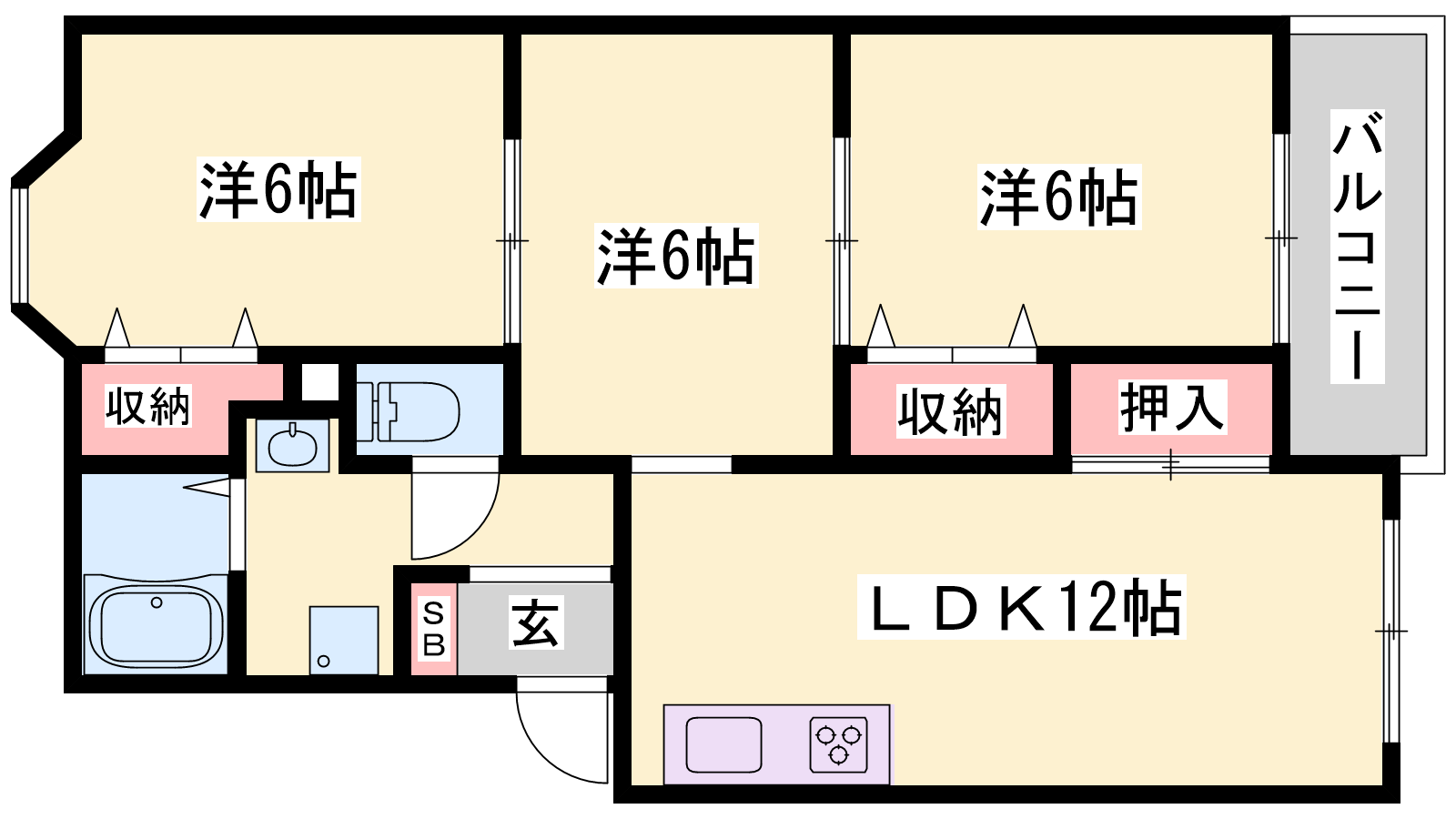- LDK12帖、洋室6帖、洋室6帖、洋室6帖