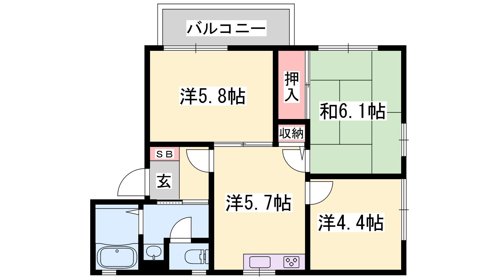 - K5.7帖、洋室5.8帖、洋室4.4帖、和室6.1帖