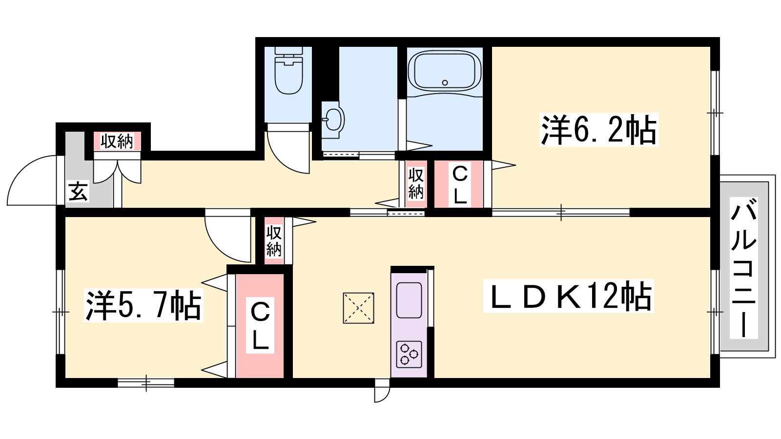 - LDK12帖、洋室6.2帖、洋室5.7帖
