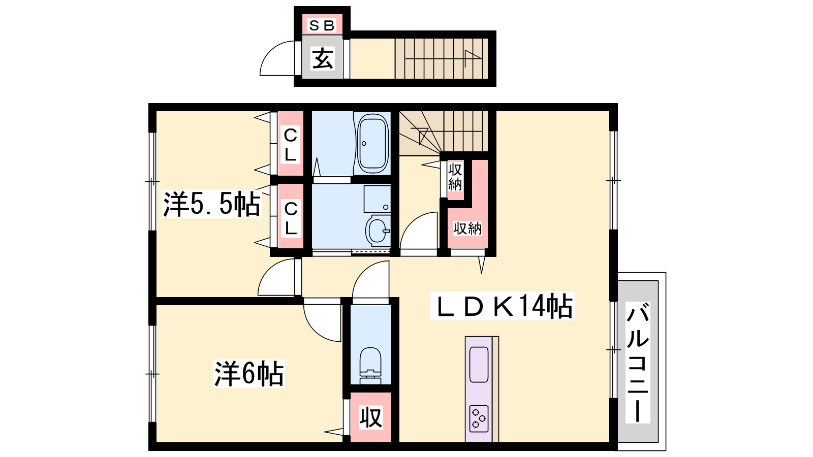 - LDK14帖、洋室6帖、洋室5.5帖