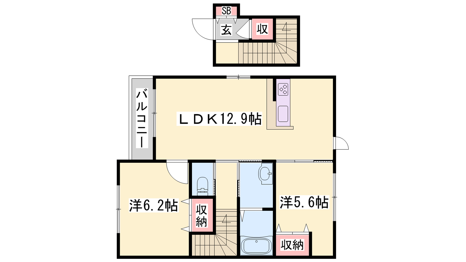 - LDK12.9帖、洋室5.6帖、洋室6.2帖